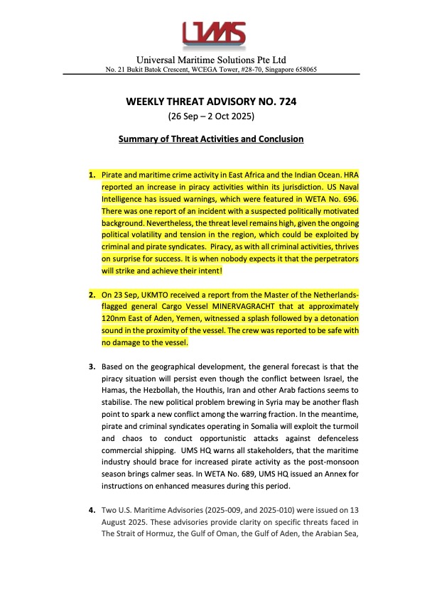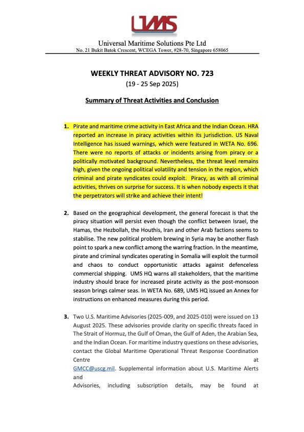 WETA is a system created for the headquarter to keep relevant parties, especially our Maritime Marshals, informed. It is sent on a weekly basis and it contains threat acitivies happening around the HRA from various sources and is consolidated in summary.