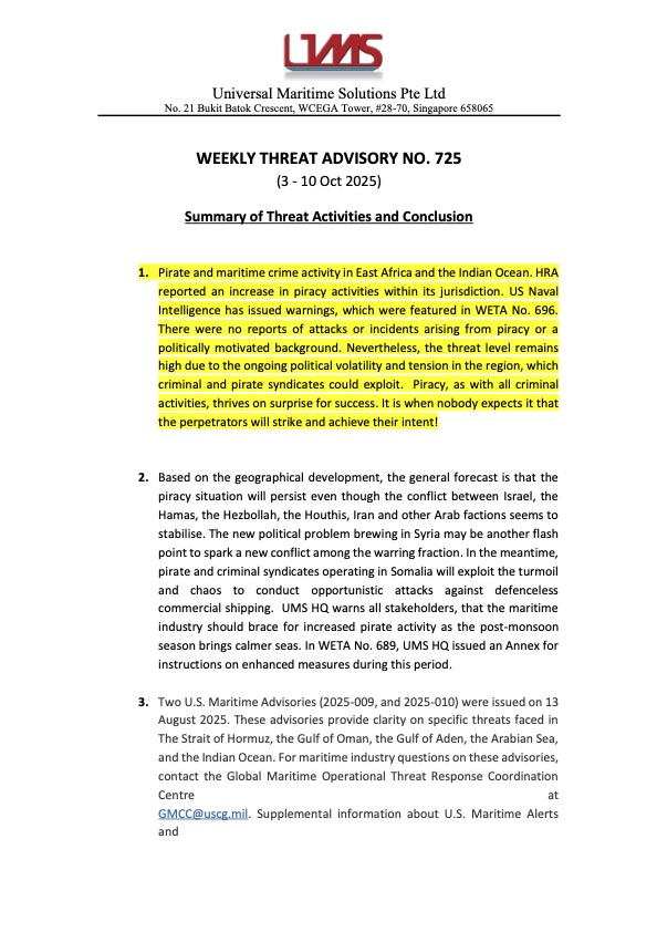 WETA is a system created for the headquarter to keep relevant parties, especially our Maritime Marshals, informed. It is sent on a weekly basis and it contains threat acitivies happening around the HRA from various sources and is consolidated in summary.