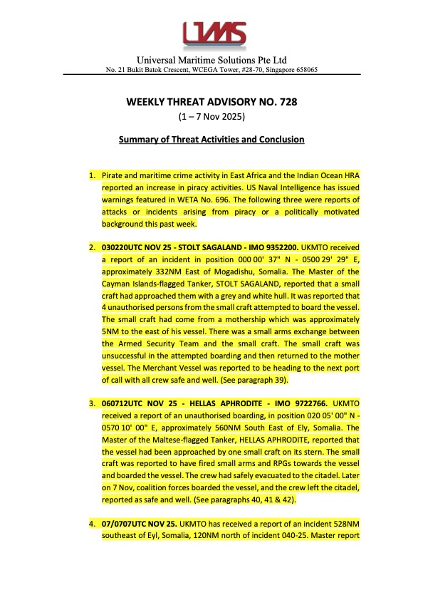 WETA is a system created for the headquarter to keep relevant parties, especially our Maritime Marshals, informed. It is sent on a weekly basis and it contains threat acitivies happening around the HRA from various sources and is consolidated in summary.