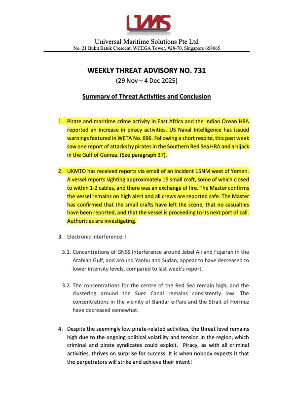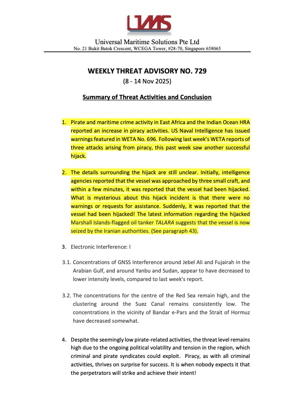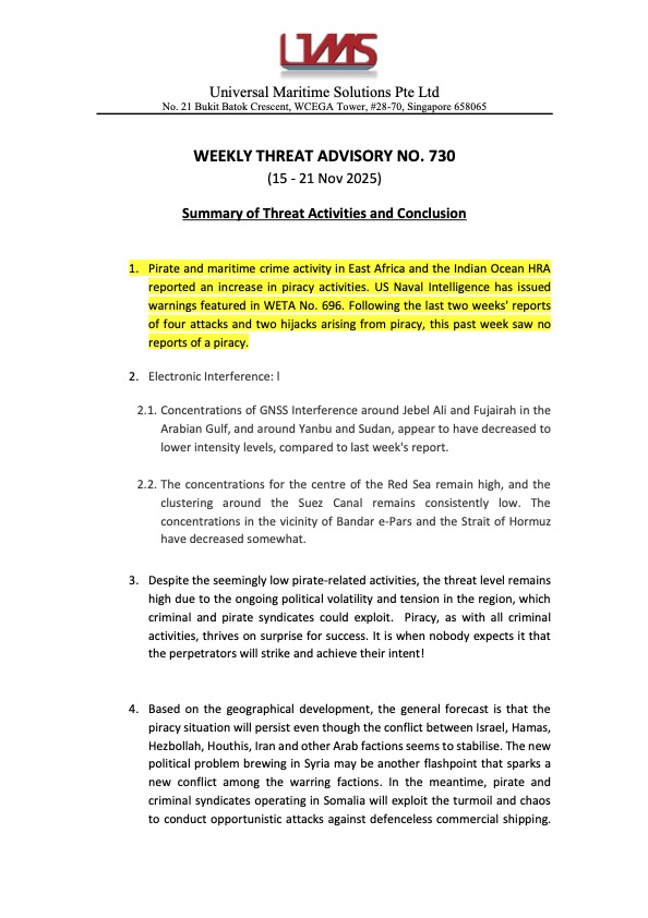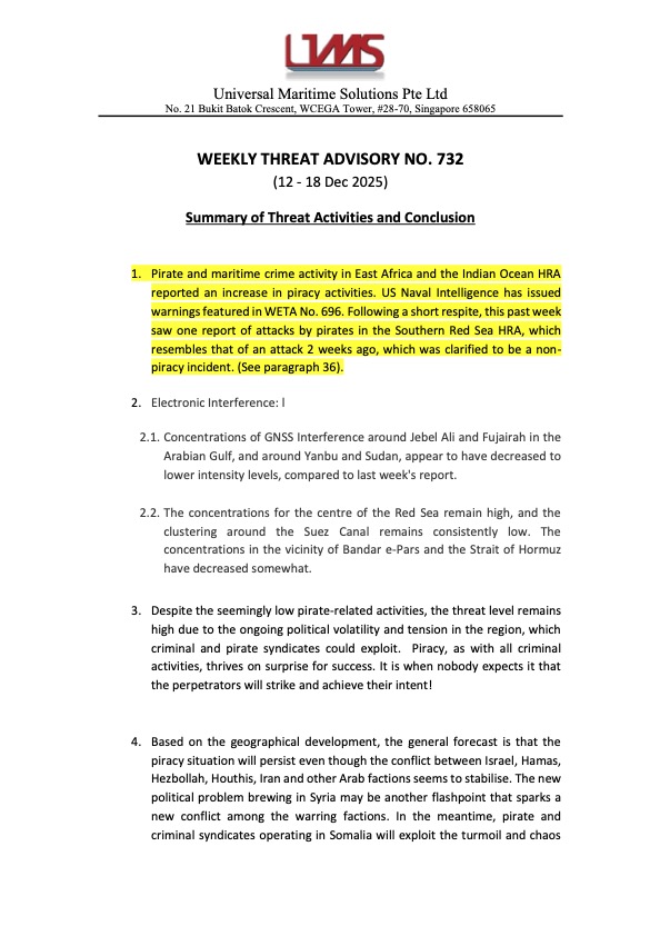 WETA is a system created for the headquarter to keep relevant parties, especially our Maritime Marshals, informed. It is sent on a weekly basis and it contains threat acitivies happening around the HRA from various sources and is consolidated in summary.