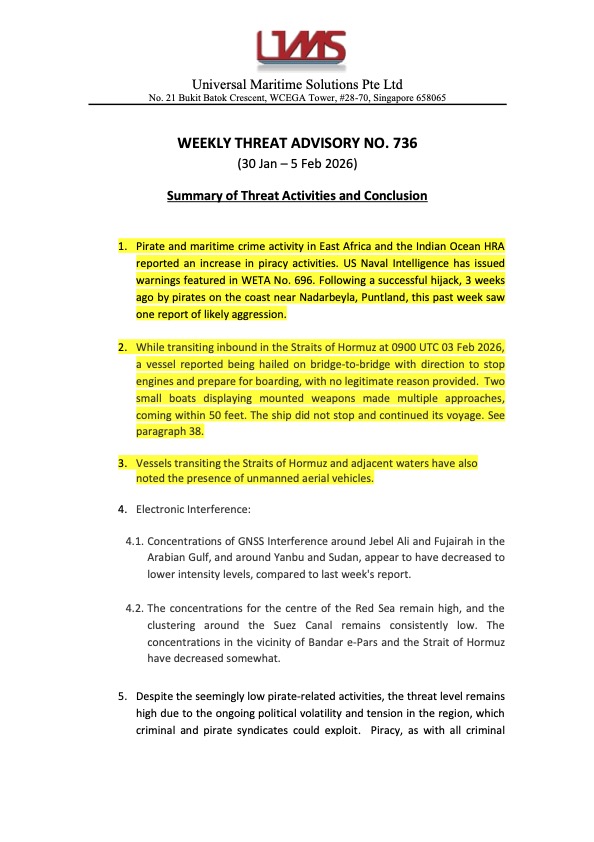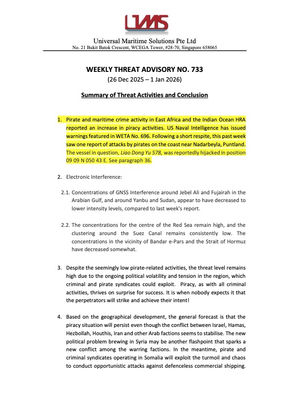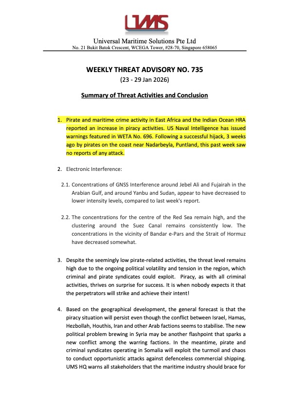 WETA is a system created for the headquarter to keep relevant parties, especially our Maritime Marshals, informed. It is sent on a weekly basis and it contains threat acitivies happening around the HRA from various sources and is consolidated in summary.