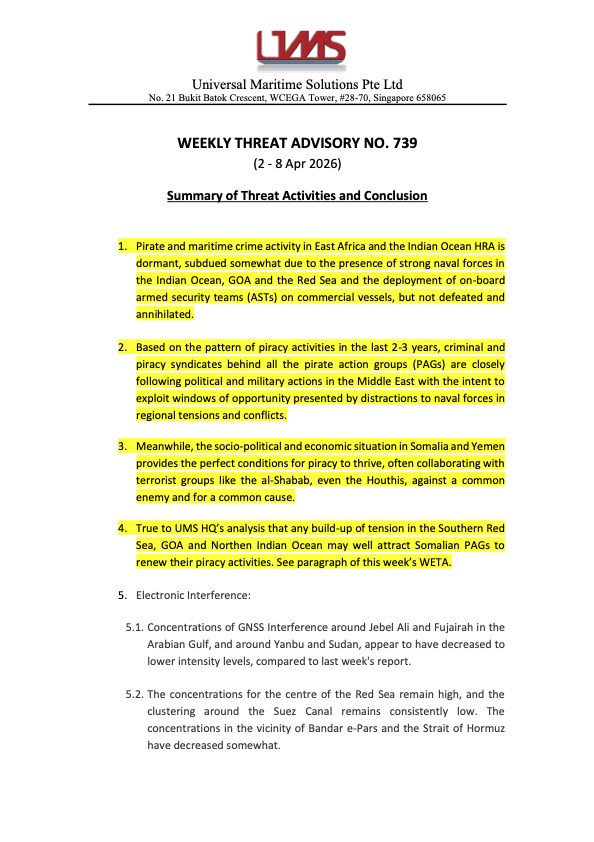 WETA is a system created for the headquarter to keep relevant parties, especially our Maritime Marshals, informed. It is sent on a weekly basis and it contains threat acitivies happening around the HRA from various sources and is consolidated in summary.